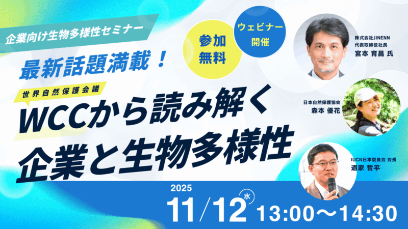 第2回は、今年10月開催の世界自然保護会議(WCC)の最新情報をご紹介。現地に参加した各登壇者が、最新の知見や世界潮流をもとに、企業がネイチャーポジティブに取り組む意義と事例を解説・紹介。今、企業に求められる「生物多様性との関わり方」に迫ります。