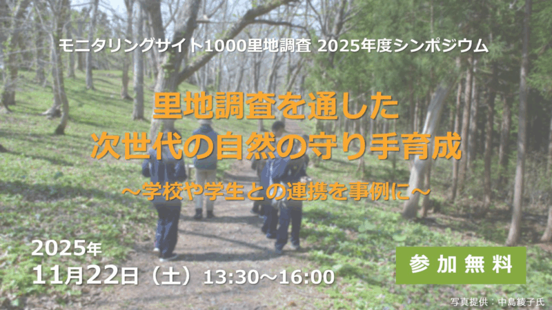 記事を読む主催:日本自然保護協会 モニタリングサイト1000里地調査 2025年度シンポジウム「里地調査を通した次世代の自然の守り手育成~学校や学生との連携を事例に~」 開催日2025年11月22日(土) 場所オンライン開催