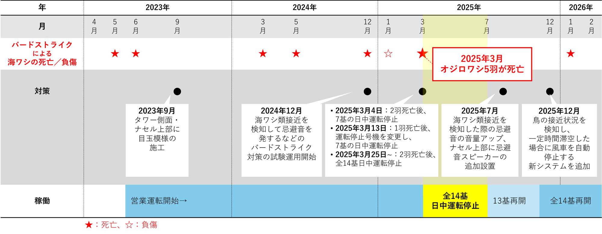 - NACS-Jは、現時点では運転停止以外に有効な対策はないとし、猛禽類の繁殖期や渡りの時期となる6月までの日中の運転停止を強く要望した。