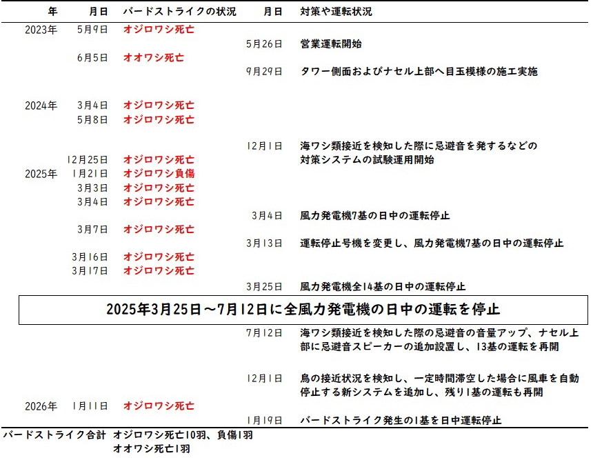 ⚫︎浜里ウインドファームは2023年5月の運転開始以来、オジロワシ11羽、オオワシ1羽のバードストライクが発生しており、これまで、目玉模様の施工や忌避音装置の設置、猛禽接近時の自動停止装置の設置をしてきたが、大きな効果はなく、継続してバードストライクが発生。特に、2025年12月には、自動停止装置を導入したばかりだが、再び2026年1月にオジロワシの衝突死が発生。