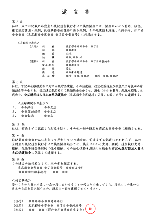 - 遺贈先の指定は登記上の正式名称でお願いします名称:公益財団法人日本自然保護協会