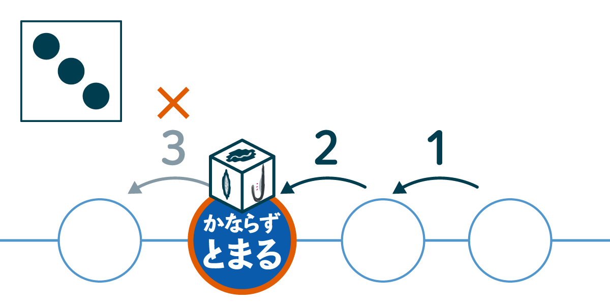 「かならずとまる」のマスでは、サイコロの数字にかかわらず、通りかかったらかならず止まってください。