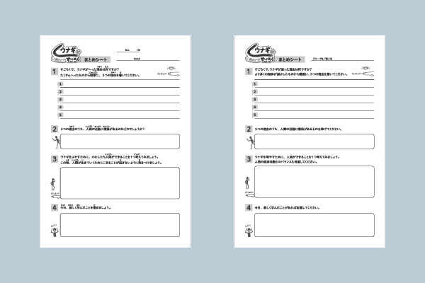 すごろくを終えて学んだことを振り返り、人の経済活動とウナギの保護のバランスについて考えてまとめるシートです。